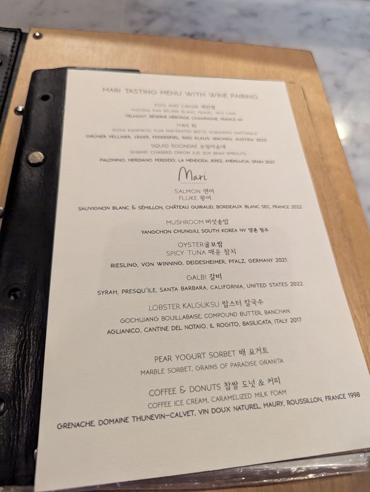 “ I avoided Mari for ages because the idea of paying sky-high prices for kimbap made me want to wither and die. Then I was surprised with a special dinner here and discovered--among other things--that they've since changed the menu and expanded their repertoire, while still staying true to the spirit of kimbap. Plus, we had VIP status with Chef Jiwon, so I kind of couldn't leave. Anywho. - Egg and Caviar: Probably my favorite dish of the menu, as it perfectly represented upscale Korean fusion done well, IMO. Also, steamed egg and caviar are just aces. - Hwe: Refreshing and crunchy, and a nice way to ensure you eat your veggies, kids. - Squid Soondae: Nice concept, a bit marred in execution on account of too-salty jus and lacklustre soondae. Also, I kept thinking of the Simpsons quote, "Lobsters stuffed with tacos" while I was eating it, but that probably says more about me than anything. - Mari: It's Mari time (cue MC Hammer dance). All were pretty and ambitious, but the best of the bunch were the delicious Mushroom, Fluke and Galbi. The Oyster was soing too much and the Spicy Tuna was too cold for me. I think we got a few off-menu ones too, courtesy of Chef, but I can't remember which were which. - Lobster Kalguksu: Ambitious as all get-out, complete with gochujang-infused bouillabaise (mmmm, briny!) and a ton of banchan. Ours came with some bonus A5 wagyu and black truffle, which was the perfect finisher. - Pear Yogurt Sorbet: The essence of Korea distilled in a frozen dessert. - Coffee & Donuts / Raspberry Sorbet: Dunkin should be required to carry fried mochi balls because they're truly the perfect kind of donut. Mmmm.... - Passionfruit Mousse with White Chocolate: I kind of blacked out by this point and devoured my bowl. I know I liked it, but I couldn't tell you anything in particular. - Petit Fours: These should just be sold in boxes. Crystallized orange rounds, chocolate and white sesame cookie sandwiches--sigh. Out of all the complimentary petit fours I've received at Michelin-starred restaurants, these have to be my favorite. Thanks again, Chef Jiwon and team, for helping us to celebrate in style! I'm sorry I totally judged you by your book cover, but I've never been happier to be proven wrong! ”