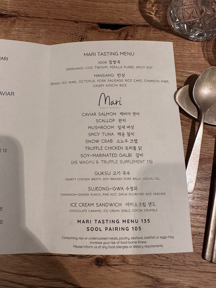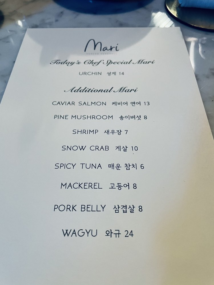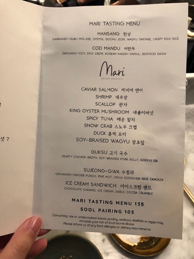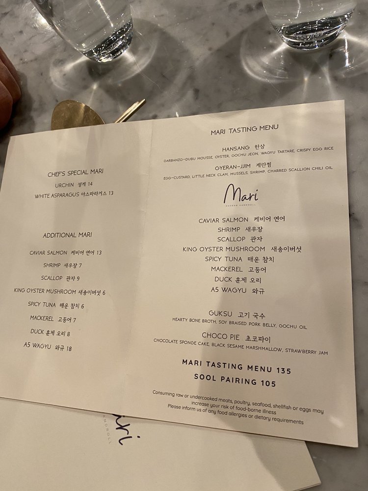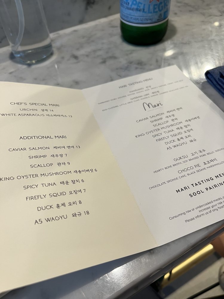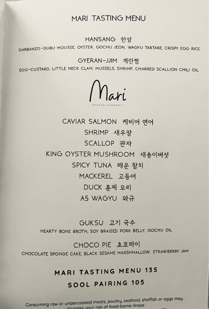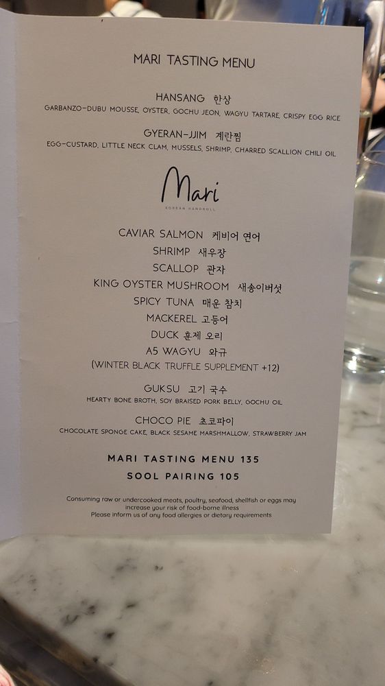 “ Just went here 2 weeks ago and we're still raving about it. Mari was recommended to me by my local friends and I knew it was a gem when they kept returning. This is the first tasting menu where I loved everything from beginning to end -- that is nearly impossible to master in my opinion. The space is small and intimate, the decor is beautiful and modern. The staff is excellent, they are so friendly and fun. They have great teamwork as well. I highly recommend a reservation here. Their tasting menu changes per season. My favorites were the egg and caviar, which was a delicious strong start, to the mushroom handroll, the spicy tuna and salmon. Honestly, everything was fabulous. It was also nice to have a noodle soup, galkuksu, to end the entrees. In addition, the mandarin yogurt sorbet was "life changing" per my husband. We cannot wait to return in the summer! ”